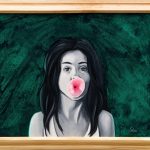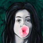 A quirky, modern style painting of a girl blowing a bubblegum.