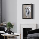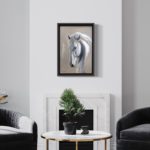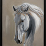 This painting captures the intelligence and grace of an unbridled white horse. The horse’s neck blends into the background, which is rich in earthy tones. The white coat of the horse stands out in stark contrast, creating a striking visual. The use of earthy colors adds a sense of grounding and connection to nature, making the horse’s wisdom all the more striking. This painting is a tribute to the horse’s ability to observe, learn and understand the world around it.