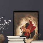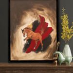 A chestnut horse jumping in front of a waving red cloth, the artist depicts movement, mood and colors reminiscent of paintings from the French Revolution.