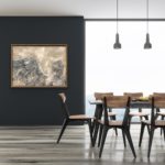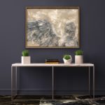 A sculpture of a winged female depicted against an earthy background with specks of raised texture sporadically spread throughout the canvas.
