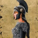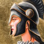 A stunning painting depicting a female dressed in a warrior’s suit and feathers on her breastplate. The warrior has golden eyes and a fierce, intelligent expression. The background is done completely in gold leaf with cracks of black showing through perfectly.